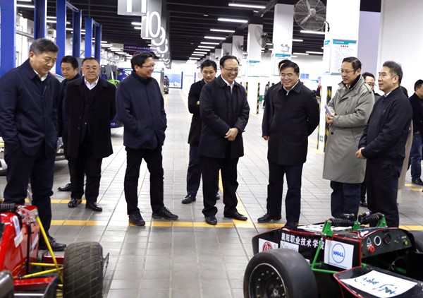 在汽车实训中心,汽车工程学院院长程洪涛按照实训功能区域,向督察组汇报了设备采购、设备现状以及利用现有设备开展大学生创新创业能力培养等情况。