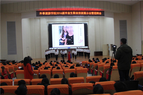 12月18日,外事旅游学院在慎思楼二号学术报告厅举行2016届毕业生职业技能展示会暨招聘会。参加本次活动的有学校就业办林颖主任、学校团总支别菊珍书记、外事旅游学院王惠院长、外事旅游学院全体行政人员、各班四位一体老师以及及来自皇冠假日酒店、襄阳旅游百事通、襄阳进出口有限公司等八家企业代表。