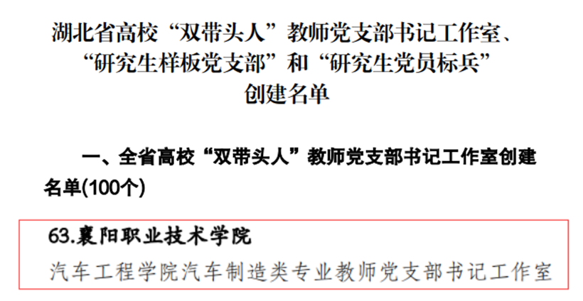 近日,湖北省高校“双带头人”教师党支部书记工作室创建名单公布。我校汽车工程学院汽车制造类专业教师党支部书记工作室成功入选。