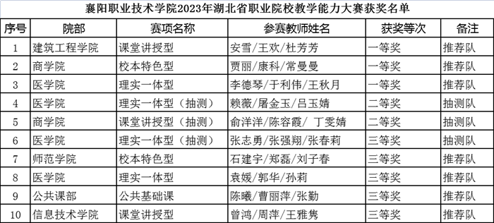 近日,2023年“中银杯”湖北省职业院校教学能力大赛成绩揭晓,我校共获高等职业教育组奖项10项。其中,一等奖3项,二等奖2项,三等奖5项。获奖总数量和一等奖获奖数量均位居全省同类院校前列。