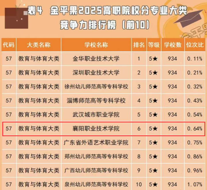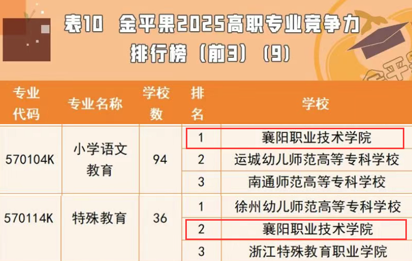 5月17日,“金平果”2025年高职专业及专业群排行榜正式发布。我校在全国934所开设有教育与体育大类的高职院校中排名第六,师范学院小学语文教育专业、特殊教育专业在全国高职院校专业竞争力排行榜中分列第一、第二名。