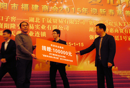 2014年1月15日,学工处处长刘明辉、学生资助管理中心主任李书建应邀参加了襄阳市福建商会“三羊开泰 爱心接力”迎新春慈善晚会,刘明辉处长代表学校现场接受了襄阳市福建商会捐赠的新三年“福建商会爱心班”爱心款10万元。
