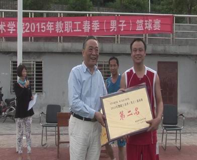 5月13日,由学校工会组织、公共课部承办的2015年教职工春季(男子)篮球赛圆满闭幕。闭幕式由学校工会副主席戢运丽主持,男篮赛总裁判长曹学宣布了2015年春季男子篮球比赛获奖集体和个人特别奖名单。学校党委书记蔡泽寰教授给获奖集体和个人颁奖,学校副校长、工会主席程光富同志致闭幕词并宣布男篮比赛闭幕。