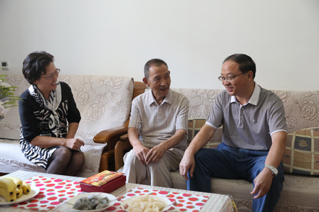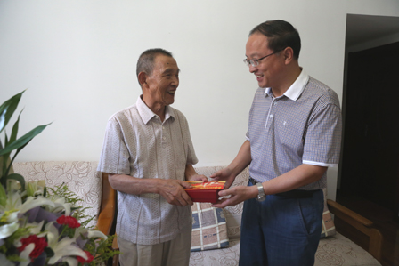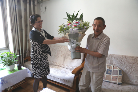 校长李菲一行来到抗战老兵谷凤桐家中,代表学校党委、行政向他送上了鲜花、抗战70周年纪念章和慰问金,并致以崇高敬意和亲切慰问。