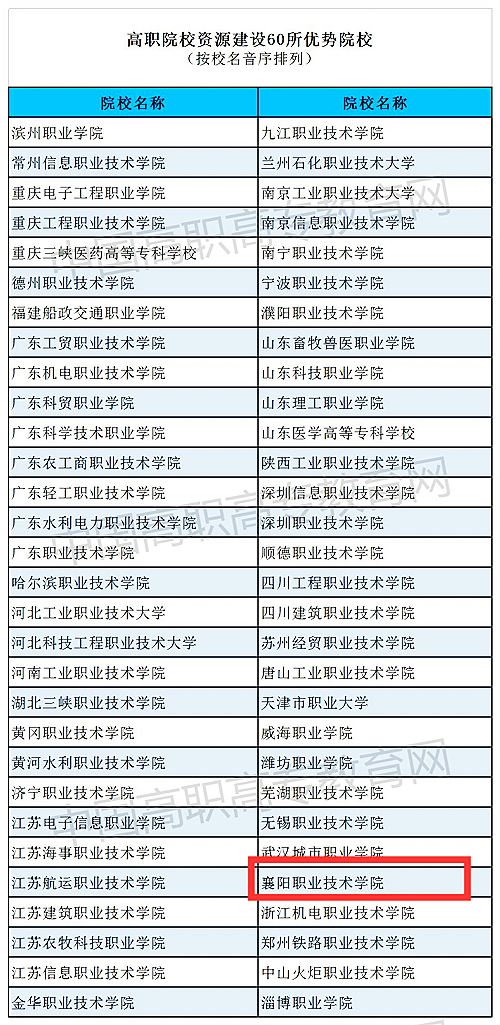 由中国教育科学研究院、全国职业高等院校校长联席会议编制的《2022中国职业教育质量年度报告》(以下简称“报告”)日前由高等教育出版社出版。报告遴选年度资源建设优势院校60所,襄阳职业技术学院位列其中。