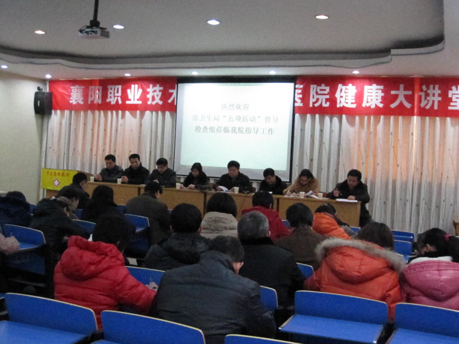 1月9日下午襄阳市卫生局督导检查工作小组专家组一行八人,来我院进行2012年度“五项活动”专项检查。“五项活动”即“三好一满意”、“荆楚质量万里行”、抗菌药物临床应用专项整治、优质护理服务示范工程创建、平安医院创建等活动;旨在通过督导检查,发现、总结和推广各医疗机构在活动中的好经验和好做法,认真梳理检查中发现的问题,提出整改意见,限期督促整改,进一步提高医疗质量,保障医疗安全,改善医疗服务,建立完善医院医疗质量和安全管理的长效机制。