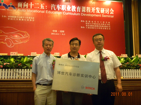 7月31日至8月3日,由中国职教学会教学工作委员会和中国汽车维修行业协会共同举办的“面向十二五:汽车职业教育课程开发研讨会”在沈阳召开。会上,教育部职成教司和博世公司共同组织了“博世汽车诊断实训中心”校企合作项目授牌仪式,我院汽车工程学院院长耿保荃代表学院接受了授牌。