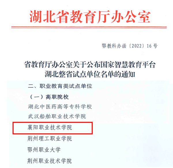 根据《教育部办公厅关于深入推进国家智慧教育平台试点有关工作的通知》(教办厅函〔2022〕46号)和《省教育厅办公室关于印发<国家智慧教育平台湖北整省试点实施方案>的通知》(鄂教科办函〔2022〕13号)等文件要求,学校组织教务处、信息技术中心等部门研制了国家智慧教育平台试点学校申报方案。近日,《省教育厅办公室关于公布国家智慧教育平台湖北整省试点单位名单的通知》(鄂教科办函〔2022〕16号)公布湖北省智慧教育平台试点单位及试点学校,我校成功获批国家智慧教育平台职业教育类试点院校。