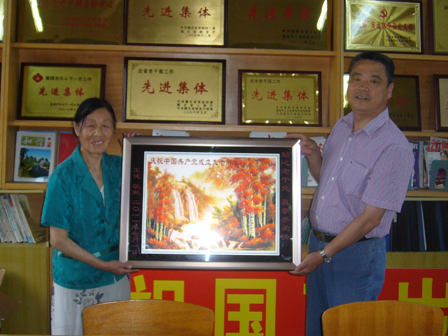 2011年6月30日上午,在喜迎中国共产党90华诞之际,离休老干部王健老师在儿子的陪同下,来到学院离退休人员工作处,送来一块写有“贴心老干处,真挚关爱情”的牌匾,衷心感谢学院党委对离退休老同志的关怀,表达对离退休人员工作处全体工作人员的真挚情感。