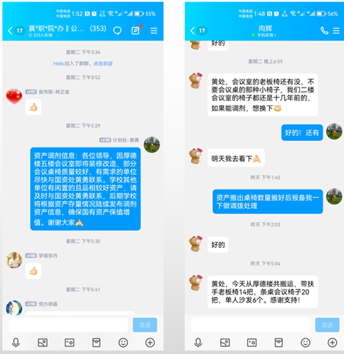 学校办公群一则办公座椅调剂信息发布后,瞬间出现4个单位抢先预订;学校办公群一则会议室改造调剂一批桌椅信息发布后,不到两天功夫,所有资产均“名花”有主。