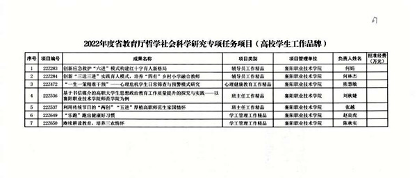 全省共有94所高校的296个项目获立项。其中,辅导员工作精品107项,心理健康教育工作精品83项,班主任工作精品44项,学工管理工作精品62项。我校立项数量居全省第4,专科院校排名第1。