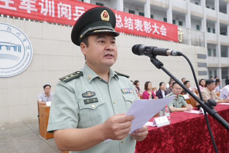 首先,中国人民解放军62116部队副大队长潘龙中校发表热情洋溢的讲话,对同学们13天的军训给予了充分肯定,他对全体新生今后的学习生活提出了殷切的希望,鼓励同学们刻苦学习、加强锻炼、掌握军事技能、增强国防意识,早日成为社会有用之才,为祖国的繁荣富强做出自己应有的贡献。