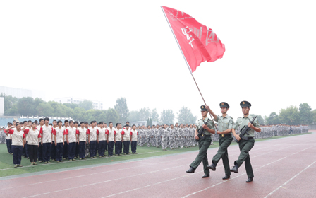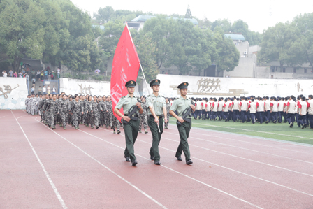 庄严的国歌声中,全体师生面向国旗行注目礼,拉开了军训阅兵式的序幕。