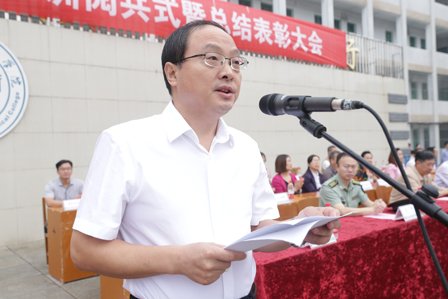 军姿飒爽展风采,豪气干云冲碧霄。9月22日上午,我校2015级新生军训阅兵式暨总结表彰大会分别在主校区、南校区运动场隆重举行。中国人民解放军62116部队副大队潘龙,襄城区武装部政委左伟,学校校长李菲,党委副书记刘爱平,纪委书记陈琦,副校长李伶、程光富,党委委员赵涛,各院(部)及各部门负责人出席大会。大会由学工处处长王保成主持。