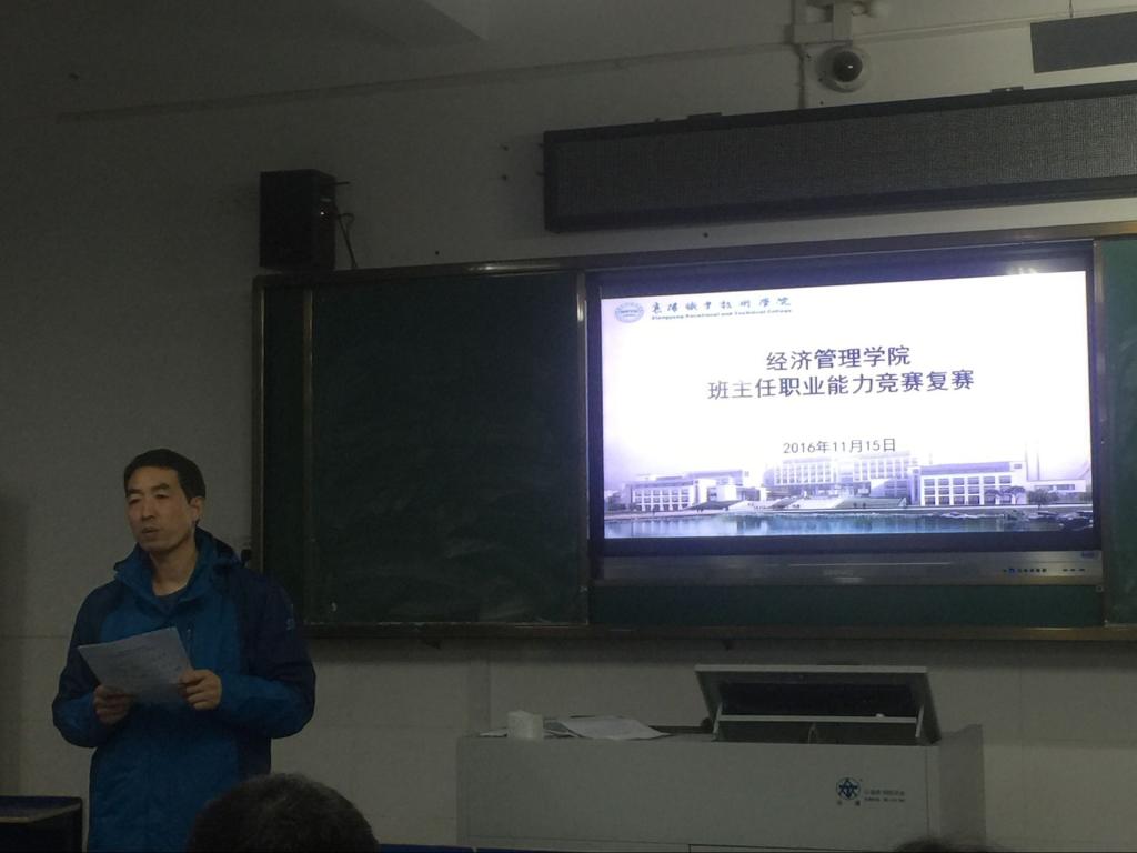 为了进一步提高班主任的职业能力和专业技术水平, 2016年11月15日晚7点,经济管理学院在笃学楼N101多媒体教室举行了班主任职业能力竞赛复赛,本次比赛的评委由学工处资质中心李书建主任、德育名师姜海华、申长永、钟爱军老师、青年教师黄茜老师组成,经济管理学院全体学工人员、辅导员班主任观摩了此次比赛。