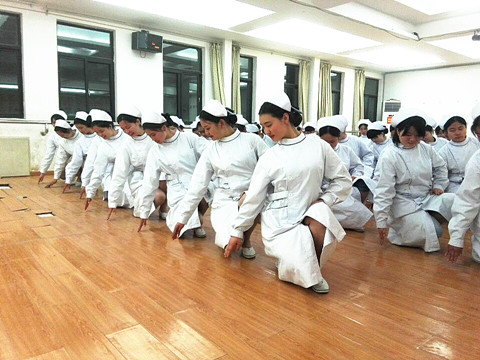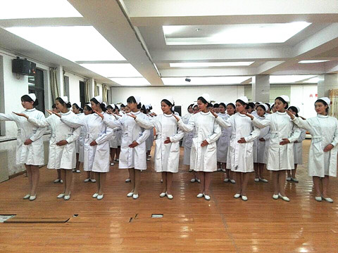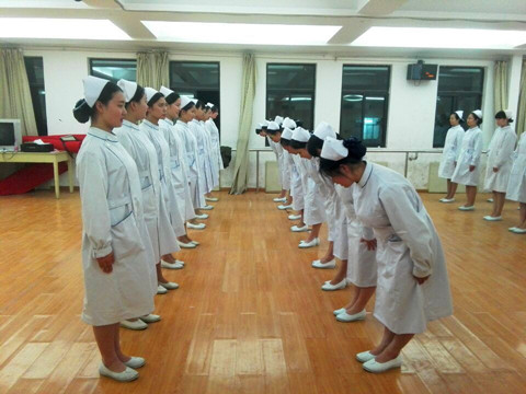 六天的护士礼仪培训分三个阶段进行:第一阶段,谢老师通过短而精的提炼,讲授了护士的基本礼仪动作,包括:站、走、坐、蹲、礼让等;结合临床工作,将拿病历夹,托治疗盘,推治疗车等礼仪动作作了示范讲授。第二阶段,把2013级护士礼仪培训的“小老师”集中起来,一对一指导2014级“小老师”,这样不仅增强了2013级“小老师” 们积极性和责任感,更为2014级“小老师”起到了模范带头作用,达到了传、帮、带的效果。第三阶段,对“小老师”们进行考核,考核达到95分以上的“小老师”指派到班级对其他同学进行教授,未达标者,继续训练直到达标方可教授班级练习。
