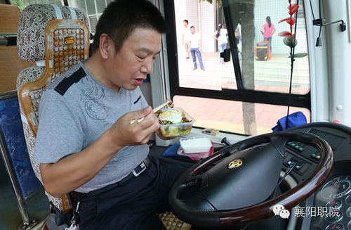 6辆车,共发出80车次,为了保证新生能安全的到校报到,我们车队的师傅们只能利用学生下车的时间在车上吃上一口饭菜了!在这里代表新生们对你们说一声:“辛苦了!”
