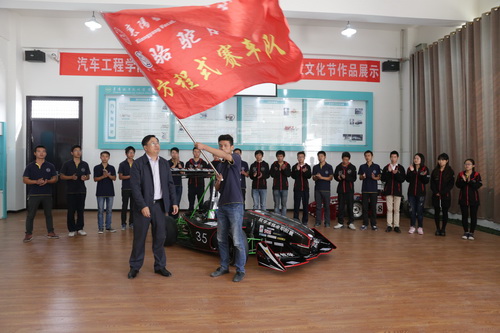 最后耿院长发表了动员性讲话,进行队旗的授予仪式,并对整个车队提出了要求和期望。他对车队老师及队员的努力予以了肯定,同时希望车队所有成员坚持不懈,争取顺利完成比赛,并希望车队获得良好的成绩。