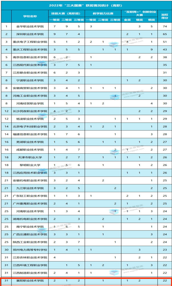 近日,“中国高职发展智库”发布2022年高职院校在三大国家级竞赛中的获奖情况,我校排名湖北第1,全国第31。较去年全国排名上升8位,两度蝉联湖北第1。