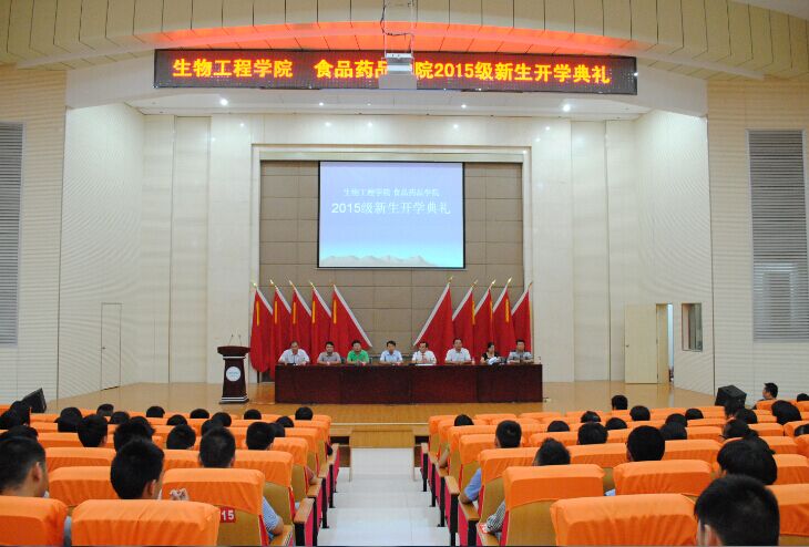 2015年9月6日下午,生物工程学院 食品药品学院2015级新生开学典礼在慎思楼2号学术报告厅隆重举行。学校副校长余荣宝、学工处处长王保成、教务处副处长熊绍刚、正大集团副总经理李涛、生物工学院 食品药品学院院长瞿宏杰以及全体教师和2015级全体新生共同出席此次开学典礼,开学典礼由副院长周文辉主持。