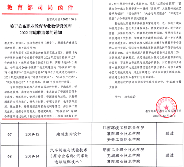 12月26日,根据教育部《关于公布职业教育专业教学资源库2022年验收结果的通知》文件精神,由我校与江西环境工程职业学院联合主持的“建筑室内设计国家级专业教学资源库”、与湖南工业职业技术学院联合主持的“汽车制造与试验技术国家级专业教学资源库”通过教育部验收。2018年,我校独立主持的特殊教育国家级专业教学资源库通过教育部验收;2019年,我校与湖南永州职业技术学院联合主持的医学检验技术国家级专业教学资源库通过教育部验收。近几年,我校共主持建设完成了4个国家级职业教育专业教学资源库,在全国同类院校中名列前茅。
