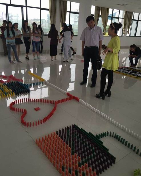 “多米诺”的乐趣不仅仅在于拼好图案。还包括是否有好的创意,图案是否围绕、突出主题,推倒时是否“一气呵成”等等。参加比赛的七支代表队的同学们,经过一个半小时小心而谨慎、紧张而激烈的拼搏,最终按时完成了自己的创意图案,然后各自派代表向裁判解说本队的创作意图。