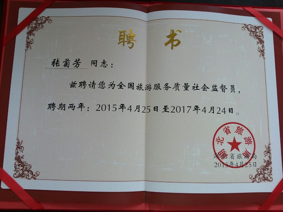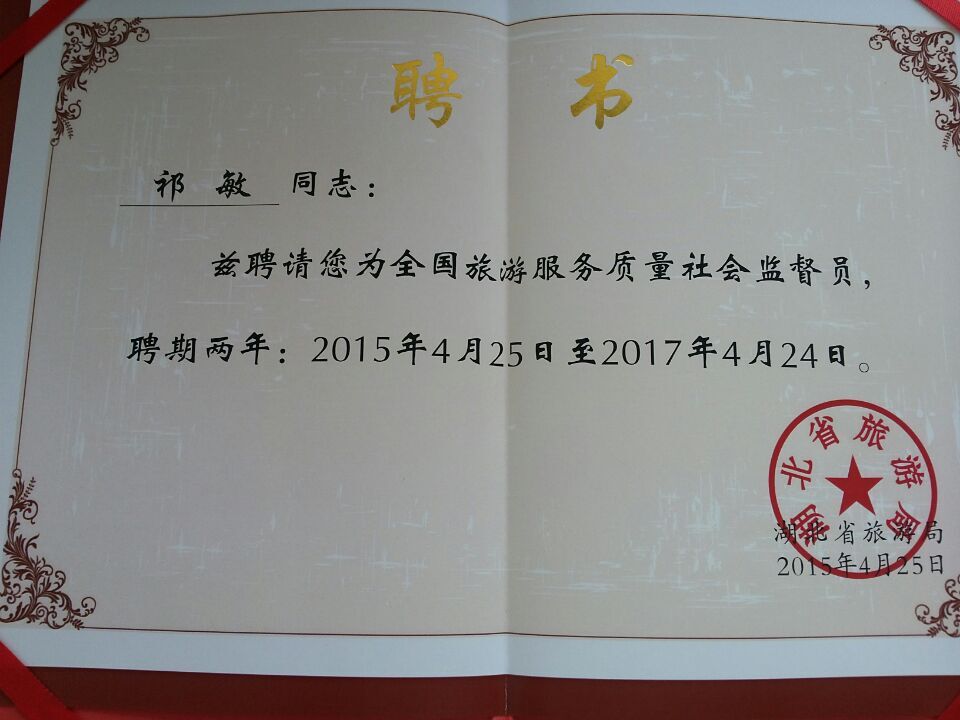 9月6日,外事旅游学院收到了襄阳市旅游局送来的两本聘书。我院张菊芳、祁敏两位教师被国家旅游局聘为全国旅游服务质量社会监督员。今年3月,国家旅游局决定在全行业建立旅游服务质量“万名监督员”制度,从各级人大、政协、相关部门、企业、专家学者、新闻媒体等人员中遴选全国旅游服务质量社会监督员。4月25日,全国旅游服务质量社会监督员选聘工作圆满完成,全国共聘任社会监督员9506名。我院祁敏、张菊芳两位教师受聘其中。