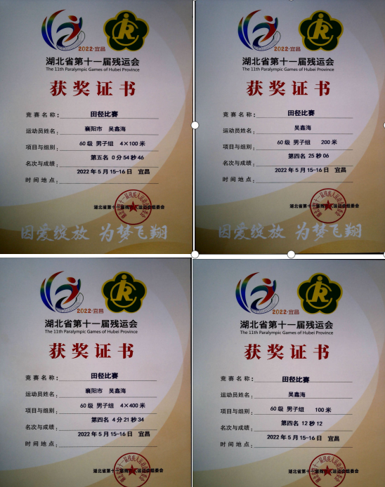 2022年5月13日,吴鑫海同学受襄阳市残联的邀请,参加湖北省第十一届残运会集训。这是吴鑫海第一次参加省残运会,由于运动量大,高强度的训练使他浑身肌肉酸痛,但他没有叫苦怕累,而是克服重重困难,反复纠正细节动作,加强体能训练,井然有序地备战省赛。