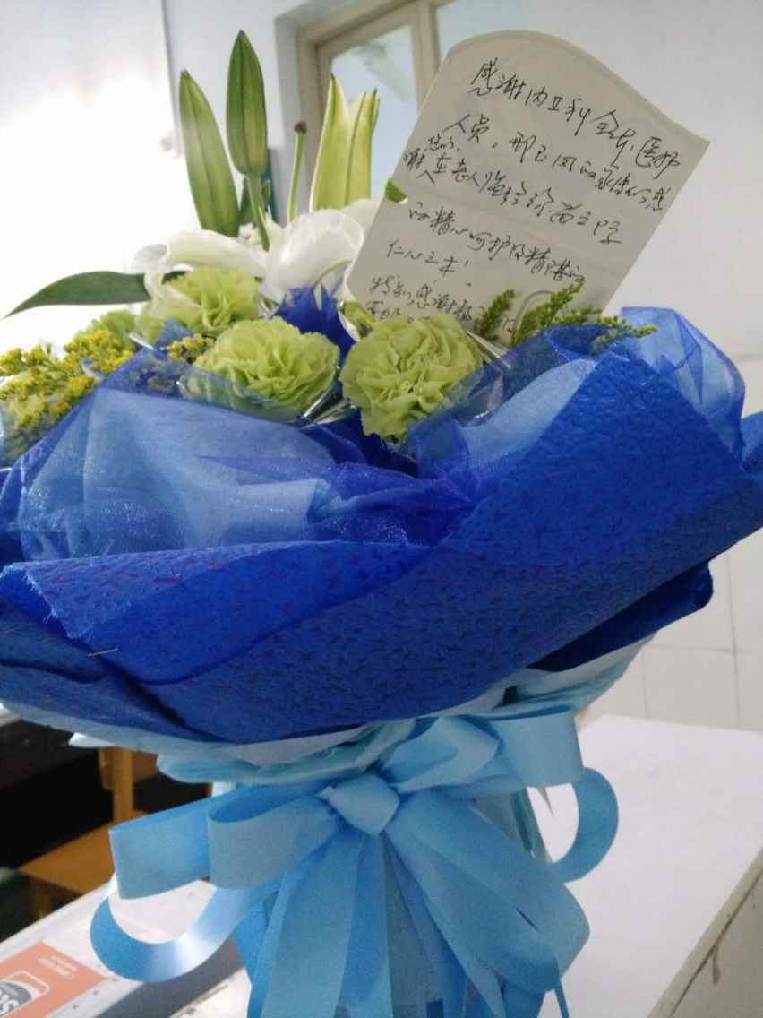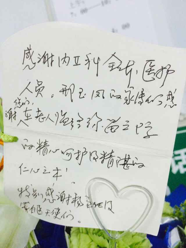 如今网上经常报道病人去世后家属和医院纠缠不休,影响医护的工作,让社会寒心。如今收到患者家属的鲜花,看见家属绽开的笑容,读着卡片上真诚的话语,我们的心暖暖的……这是对我们辛勤工作的肯定,今后我们一定更加努力工作。