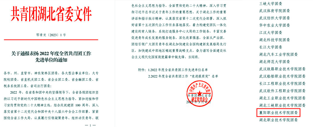 近日,共青团湖北省委印发《关于通报表扬2022年度全省共青团工作先进单位的通知》,我校团委被评为湖北省“2022年度全省共青团工作先进单位”。这是我校连续两年获此殊荣。