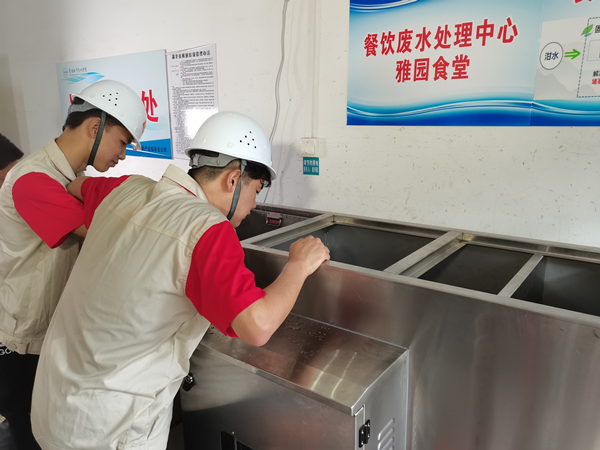 期间,团队采集3127份油脂颗粒,分析油脂成分,独创微纳米气浮工艺模型用纯物理工艺,实现除油率98.9%,处于国内领先、世界一流水平;经过1263次工艺打磨,设计出除渣链板的最优孔径等参数;经过213天的平台耐压测试,搭建物联网台账监管系统,全程监控餐饮废水排放;独创油、水、渣微生态循环模式,变废为宝。