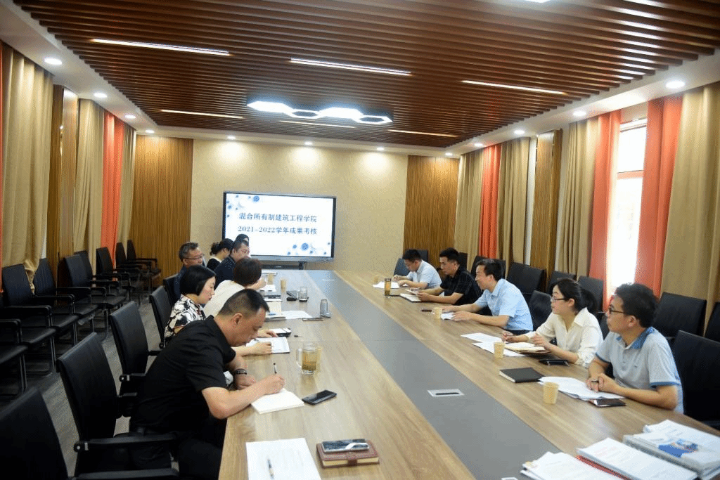 建筑工程学院院长李炳顺从常规工作保稳定,师生大赛出成果,“校企混编、专兼结合”“课岗证赛”创新团队建设促发展三个方面总结2021—2022学年混合所有制建筑工程学院运行情况和取得的成果。随后,考核小组查阅了相关支撑材料。