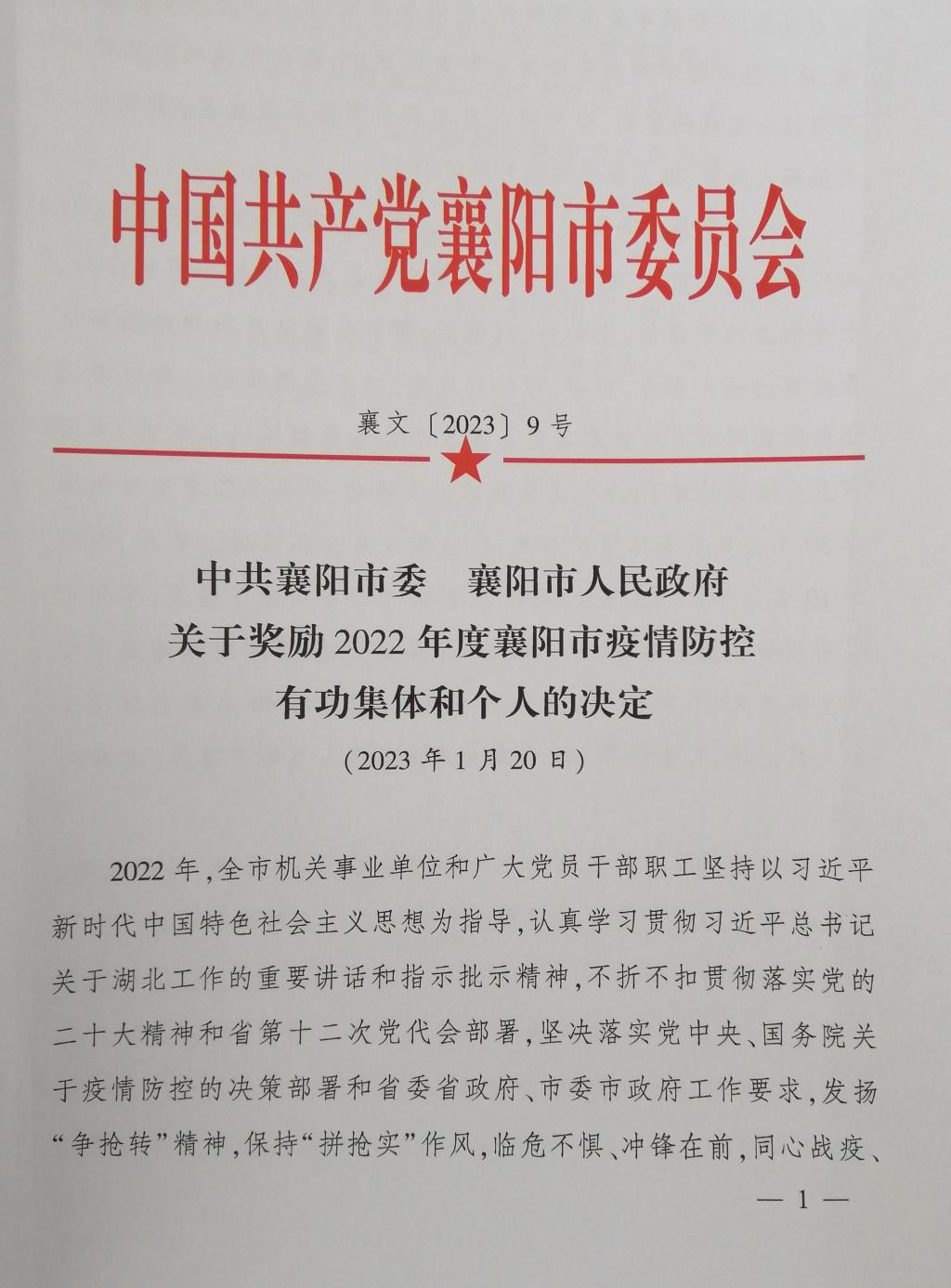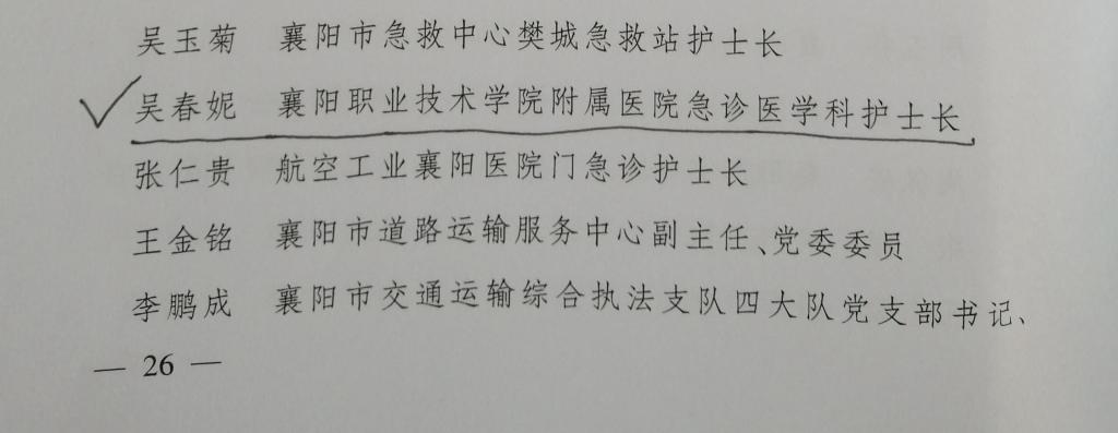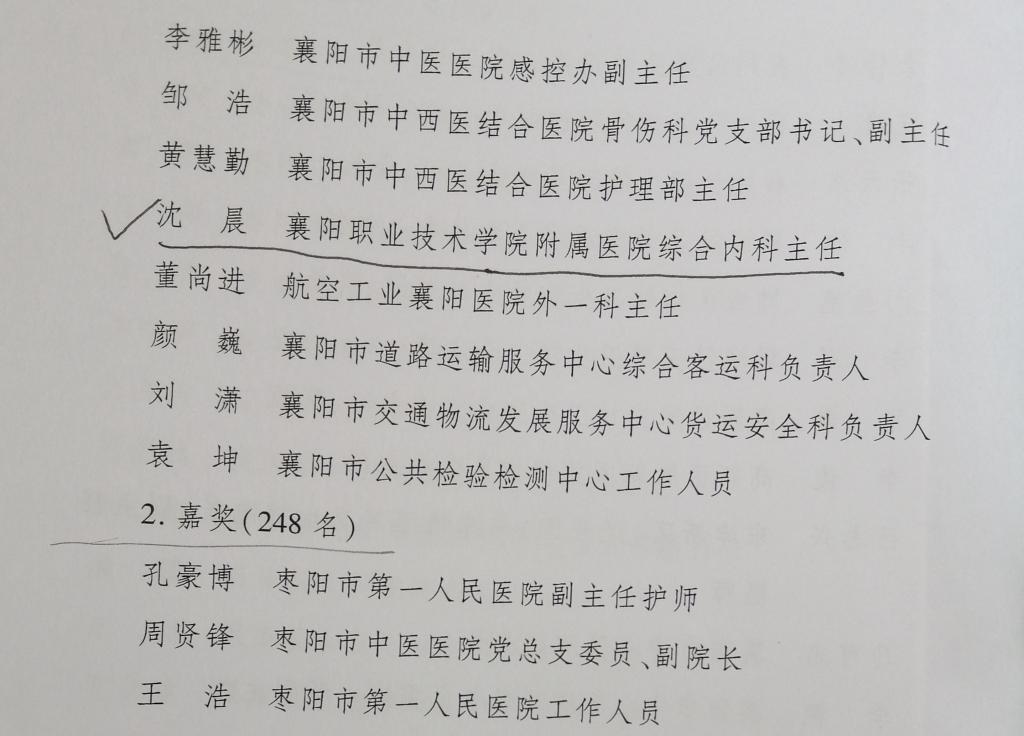 近日,襄阳市委、襄阳市人民政府发布《关于奖励2022年度襄阳市疫情防控有功集体和个人的决定》,我校三人榜上有名。附属医院综合内科主任沈晨获记功,附属医院急诊医学科护士长吴春妮、学工处副处长赵良虎获嘉奖。