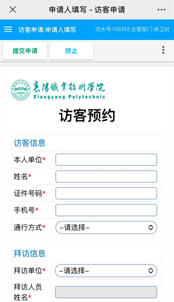 为进一步加强校园安全管理,提高访客来访预约、审批、通行效率,更好服务各单位正常业务开展,抓实抓细访客人员的精准管理,学校出台“访客预约”制度——通过关注“襄阳职业技术学院”微信公众号,输入基本信息,经拜访部门审核后,访客可直接通行入校。