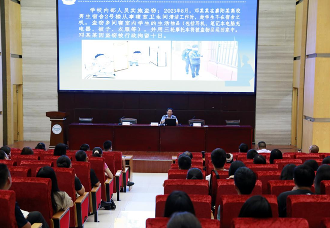 此次培训分为两个阶段。第一阶段,学校邀请襄城公安分局法治大队长黄斌授课。法治课上,黄斌以《高校安全事件分析与预防》为题,结合近年来校园发生的各类案例,如学生因不锁门发生被盗、贪图蝇头小利网络刷单、情感纠纷引发打架斗殴、意识形态淡化误入歧途等,深入剖析了各类案事件的成因,阐述了安全事故带来的严重后果,针对性地给出了综合治理对策建议。