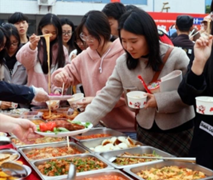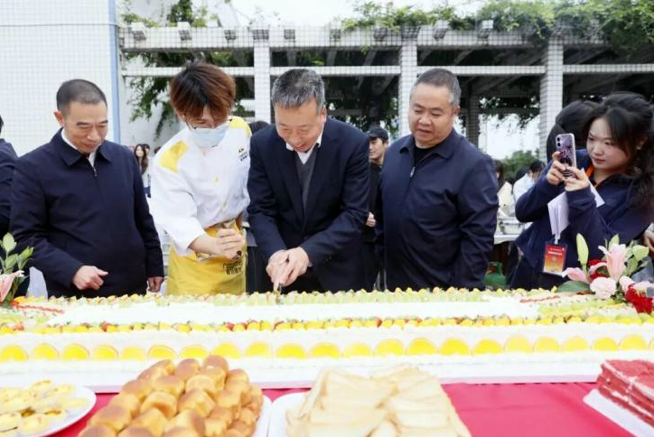 “家乡味道大比拼”环节,各院系师生共同合作,为大家展示自己家乡的美食。活动现场,一个巨型定制蛋糕惊艳亮相,校长余荣宝现场分切,师生们共同分享这份甜蜜与喜悦,欢声笑语弥漫在校园的每个角落。
