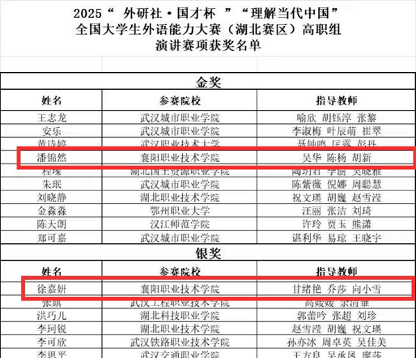 10月25日至26日,由武汉大学主办、湖北省高等教育学会大学外语教学专业委员会协办、武汉城市职业学院承办的2025“外研社・国才杯”“理解当代中国”全国大学生外语能力大赛(湖北赛区)高职组演讲比赛在武汉城市职业学院举行。本次比赛吸引了来自全省47所高校的101名选手(含英语专业)参加。我校机械制造及自动化专业潘锦然、口腔医学专业徐嘉妍表现亮眼,分别斩获金奖(总排名第四)、银奖(总排名第十一名)。