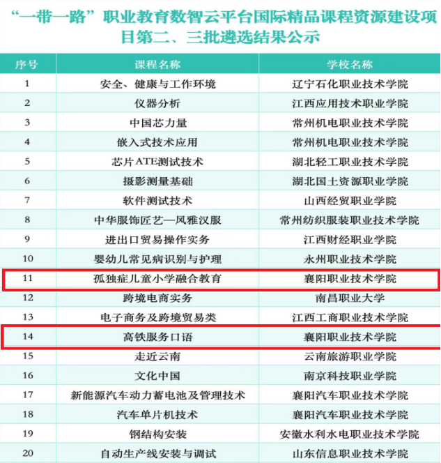 近日,我校申报的《高铁服务口语》《孤独症儿童小学融合教育》两门课程顺利通过“一带一路”职业教育数智云平台国际精品课程资源建设项目遴选评审。