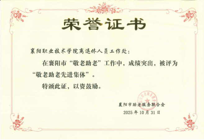 10月31日下午,襄阳市助老服务联合会在市农工医院召开“敬老助老”工作总结表彰大会。我校离退处凭借在敬老助老工作中取得的显著成效,被授予“敬老助老先进集体”荣誉称号。同时,离退处处长赵杰被授予“敬老助老先进个人”荣誉称号。