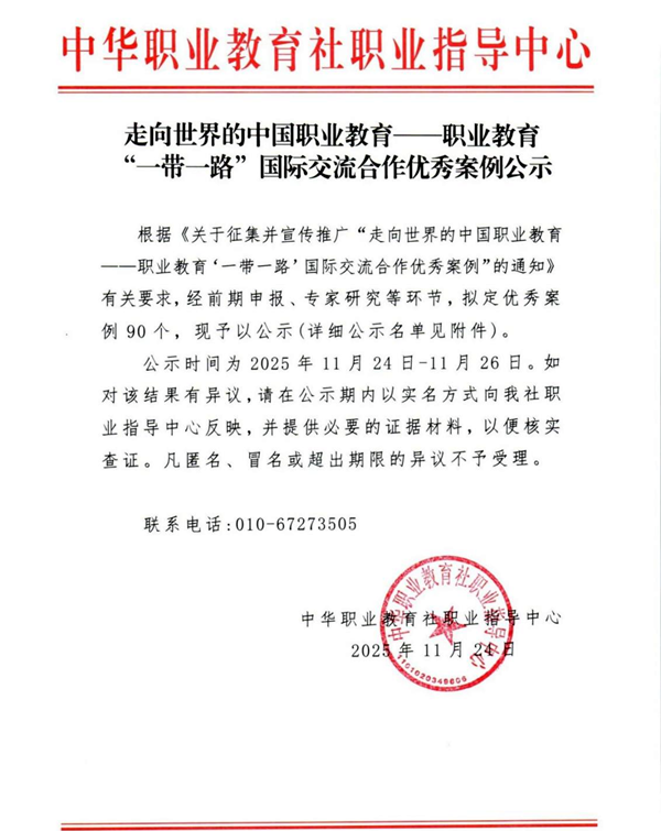 据悉,经中华职业教育社批复同意,案例将在第二届“一带一路”职业教育国际论坛召开期间展示推介,并在中国教育电视台、中华儿女报刊社及部分中央媒体支持下,作为典型案例,进行宣传推广。