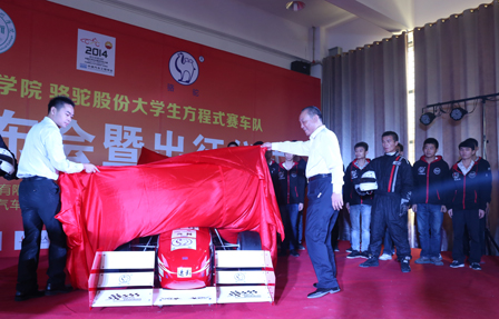 校长蔡泽寰教授和骆驼股份有限公司负责人叶立虎,为速影2号赛车揭幕,副校长程光富为赛车队授旗。赛车队队长周伟在新闻发布会进行了郑重宣誓。