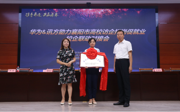 会议最后,讯方公司华中片区总经理易君与学校副校长余荣宝共同为“校企就业实习基地”揭牌。