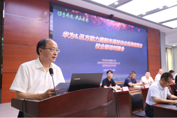 7月14日,华为&讯方助力襄阳高校访企拓岗促就业校企联动对接会在我校召开。学校校长李菲、副校长余荣宝,创新创业与就业指导中心主任林颖、产学研工作处副处长龙耀辉,信息技术学院总支书记汤才虎、院长王保成,华为技术有限公司湖北政企副总经理姚传磊、华为襄阳总经理潘锦东及襄阳地区负责人, 深圳市讯方技术股份有限公司教育系统部总经理唐先永,华中片区总经理易君及省内相关负责人代表,以及16家华为襄阳市本地合作企业代表出席了对接会。会议由汤才虎主持。