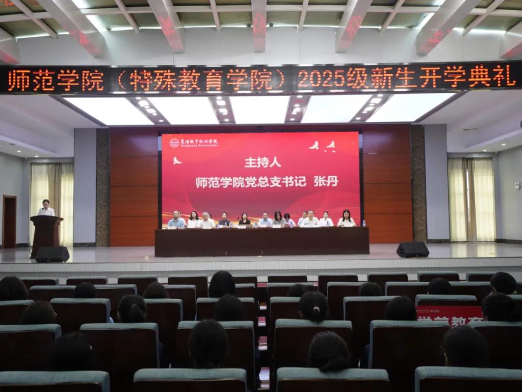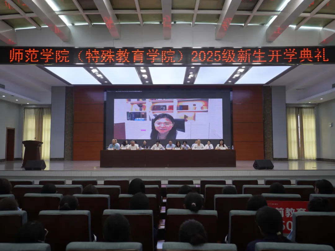 9月9日上午,师范学院(特殊教育学院)在智能制造大楼四楼报告厅举行2025级新生开学典礼。“中国好人”、优秀校友代表何立玲,教务处副处长周秀丽,师范学院全体行政人员、专职辅导员及2025级新生参加典礼。活动由师范学院党总支书记张丹主持。
