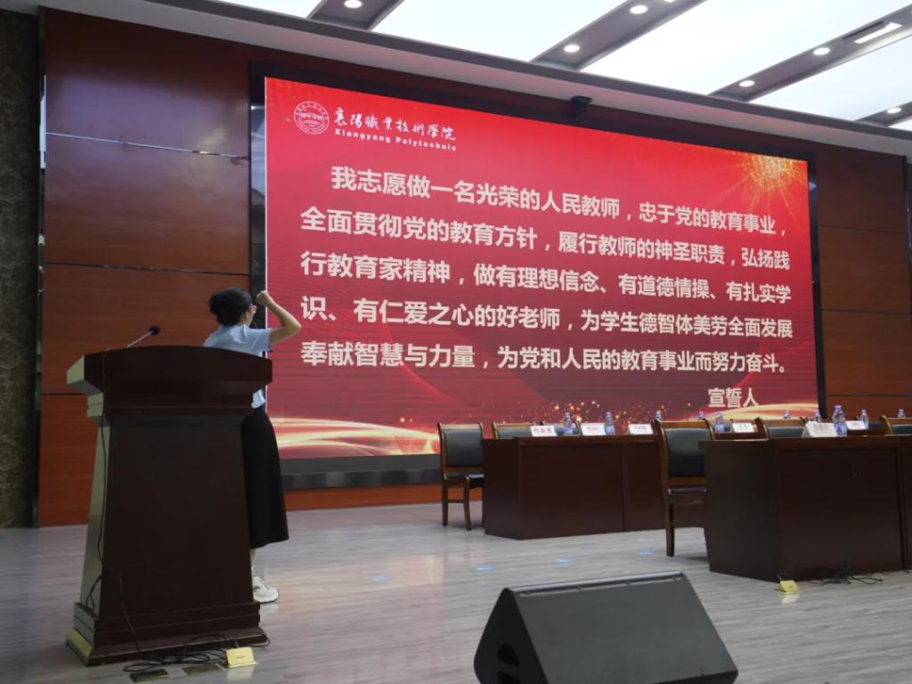 “我志愿做一名光荣的人民教师,忠于党的教育事业……”新招录教师张淑玲带领全体师生宣誓。副院长彭建设作入学教育安排。