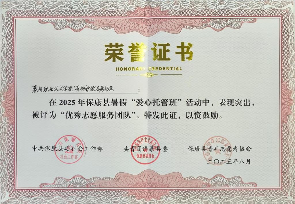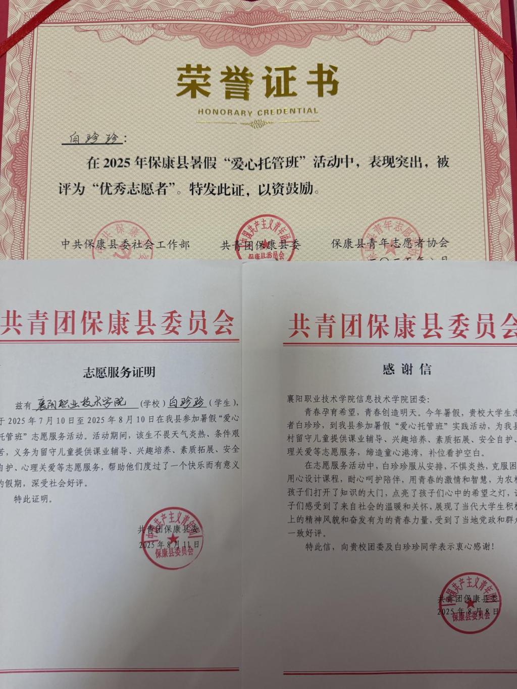 近日,信息技术学院收到共青团保康县委发来的荣誉证书与感谢信,学院“青衿护绿”志愿服务队凭借优异的志愿服务,获评2025年保康县暑期“爱心托管班”活动“优秀志愿服务队”,学生白珍珍、曹文强获评“优秀志愿者”。