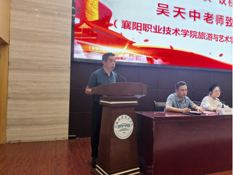 开学典礼上,旅游与艺术学院党总支书记吴天中发表致辞。他向新生们表示热烈欢迎,介绍了学院的专业特色与发展成果。吴书记还特别关注到新生中的“小幸运”,当场点名祝贺9月8日、9日、10日过生日的同学,送上“生日快乐”的祝福,突如其来的暖心互动瞬间点燃现场气氛,掌声与欢呼声此起彼伏。最后,他勉励全体新生在大学时光里涵养品行、锤炼本领,成长为兼具文旅素养与艺术能力的优秀人才。
