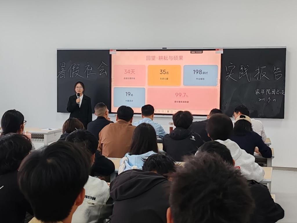 会上,多位学生分享实践经历:有的在社区开展爱心托管,陪伴留守儿童;有的走进食品、种业公司,参与产品研发与自动化包装工作;有的深入乡村社区,普及防诈骗知识,助力电信服务下乡;动物医学专业的学生还在宠物医院积累诊疗经验,各有收获。