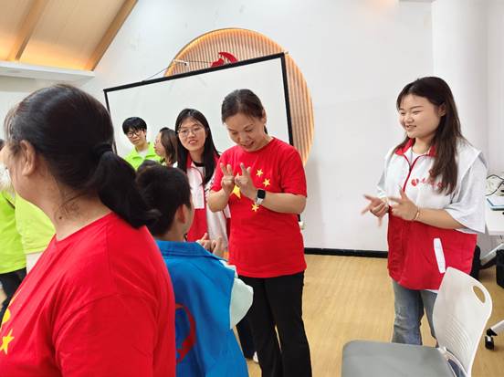 活动中,特殊教育专业志愿者与向阳残疾人艺术团合作演绎手势舞蹈《我和我的祖国》,以无声的韵律传递深情,共抒家国情怀。在手语互动环节,青年志愿者们协助聋人朋友开展“你划我猜”趣味游戏。现场气氛温馨而活跃,沟通无界,笑语不断。