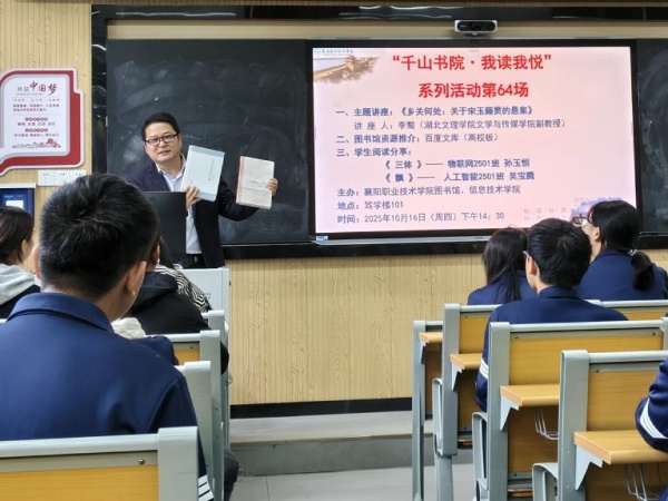 10月16日下午,“千山书院・我读我悦”系列活动第64场在笃学楼举办。应学校图书馆邀请,湖北文理学院教授李骜围绕“乡关何处:关于宋玉籍贯的悬案”主题,作精彩分享。信息技术学院学生参加活动。